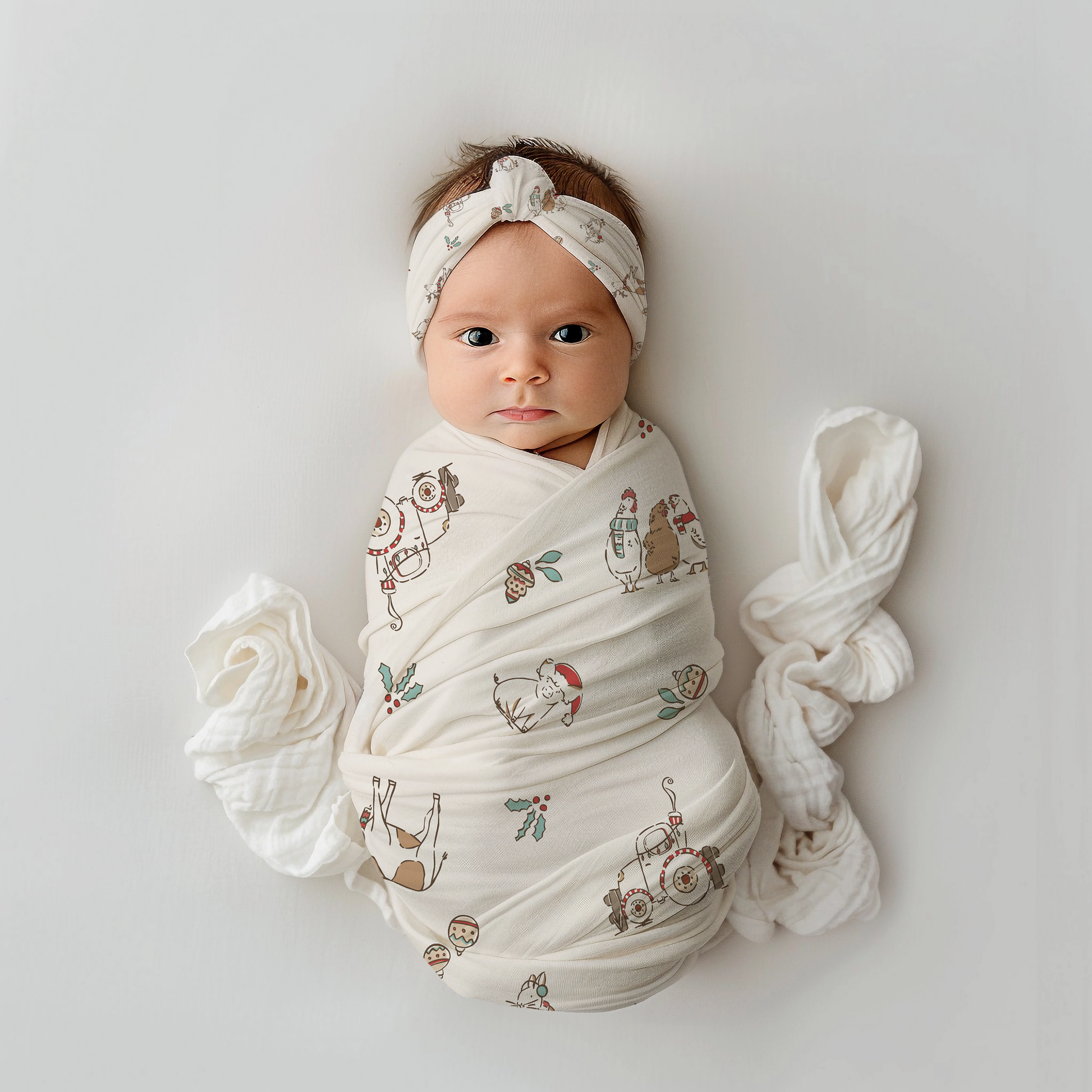Wrap your little one in festive farmyard coziness! This Christmas on the Farm baby swaddle blanket is soft, sweet, and filled with holiday charm. From tractor rides to twinkling lights, every detail captures the magic of a farm-style Christmas. Perfect for newborn photos, cozy naps, or as an adorable nursery accent.
